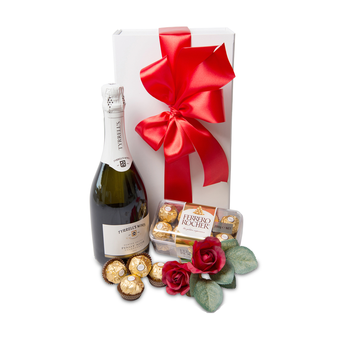A sparkling Pinot Chardonnay – Champagne style – from Tyrrells Winery – Hunter Valley with a perennial favourite – Ferrero Rocher chocolates.