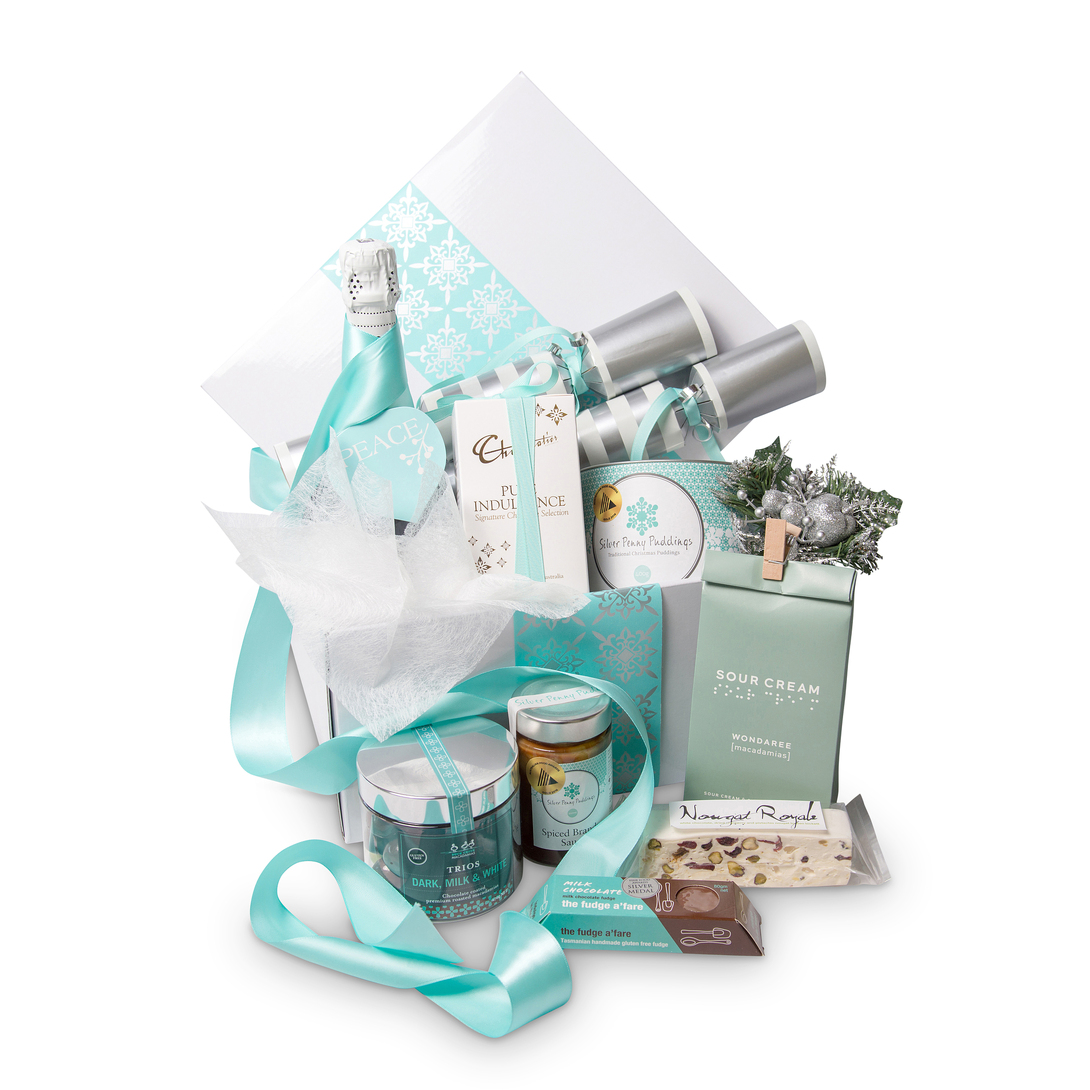 - XLarge gloss white gift box with ribbon, trim, silver Christmas pick, 2 x silver Christmas crackers and gift card
