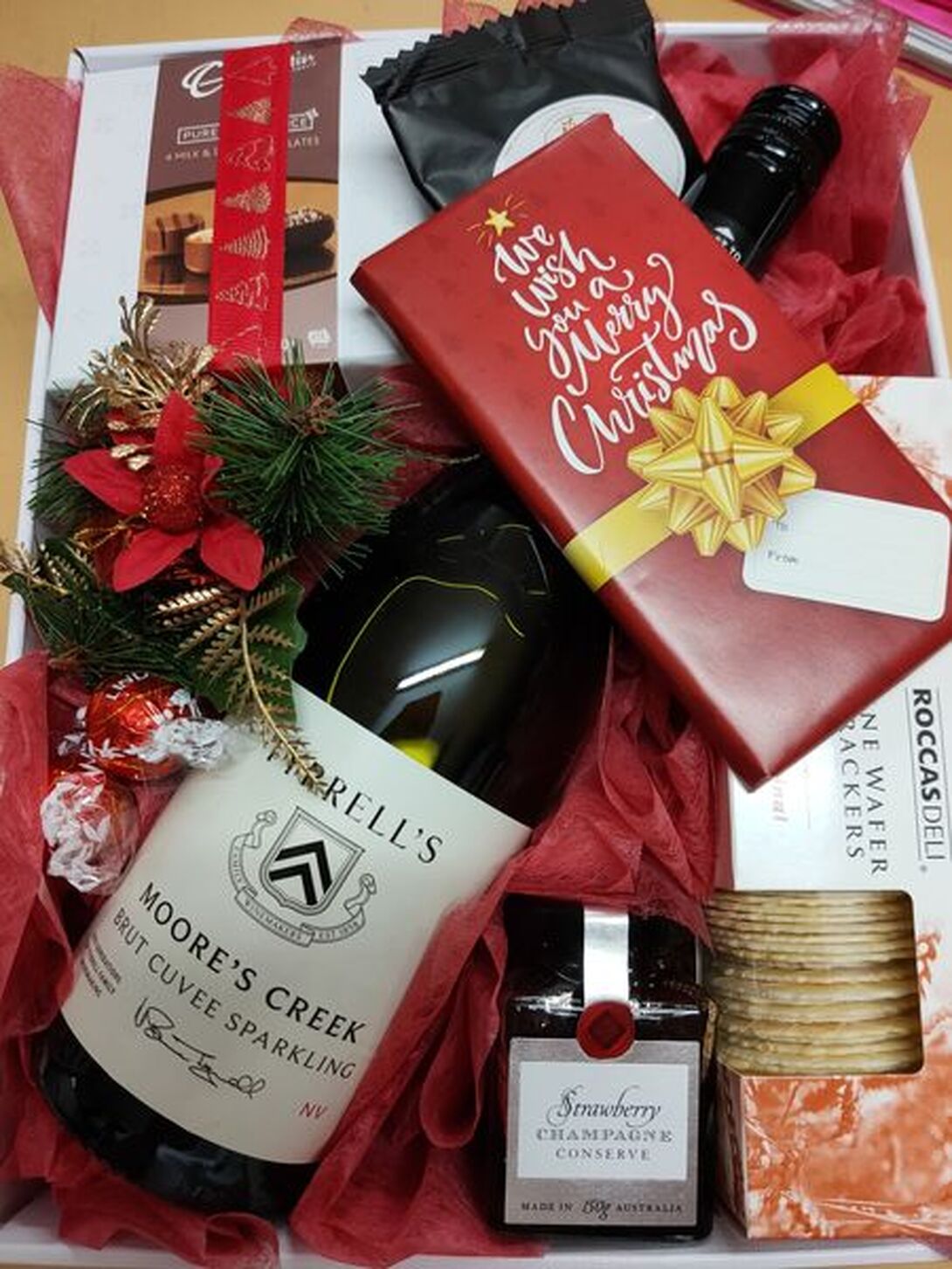 It contains Chocolatier Mini Assortment, Bubbles, Crackers, Nuts and Anitpasto - Roasted Peppers and Olives or Champagne Strawberry Conserve and a Merry Christmas Chocolate Bar. $59 plus delivery.