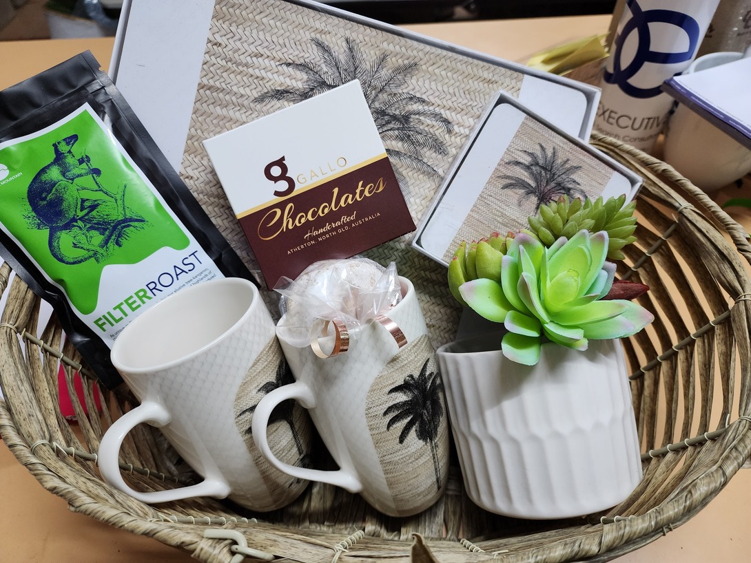 2 x ceramic mugs, 1 x boxed set 6 placemats and coasters, faux succulent in a ceramic pot presented in a quality open picnic basket with handles. $110 plus delivery