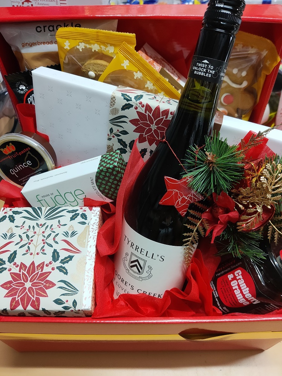 It incudes - 190gm Chocolatier Mixed Assortment, Your choice of Sem Sauv Blanc, Cab Sauv or Bubbles, Artisan Christmas Cake, Chrstmas Fudge, Nougat, Cranberry and Orange Sauce, 2 x iced Christmas Cookies, Shortbread, Crackers, Local Macadamia Nuts, Fruit Paste - Loose assorted Christmas Chocolates and more..