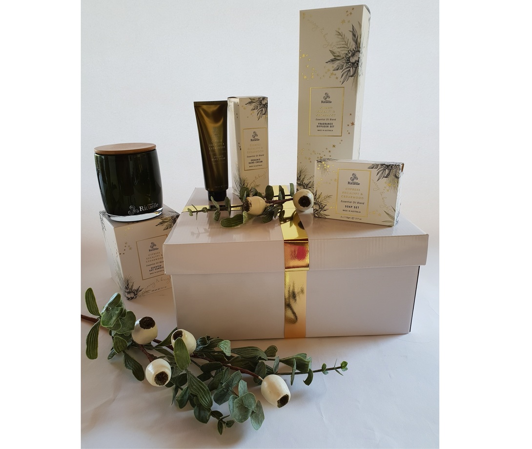 The complete collection presented in a white gloss reusable quality gift box, wrapped with golf ribbon and decorated with Eucalypt and Gumnut spray and gift card and includes