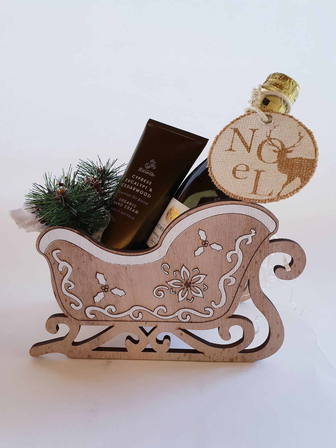 Simple pleasures to give and receive - a luxury Hand Cream and Piccolo of Jacob’s Creek Pinot Chardonnay beautifully cello wrapped in a natural and white wooden sleigh with Christmas pinecone pick and gift tag.