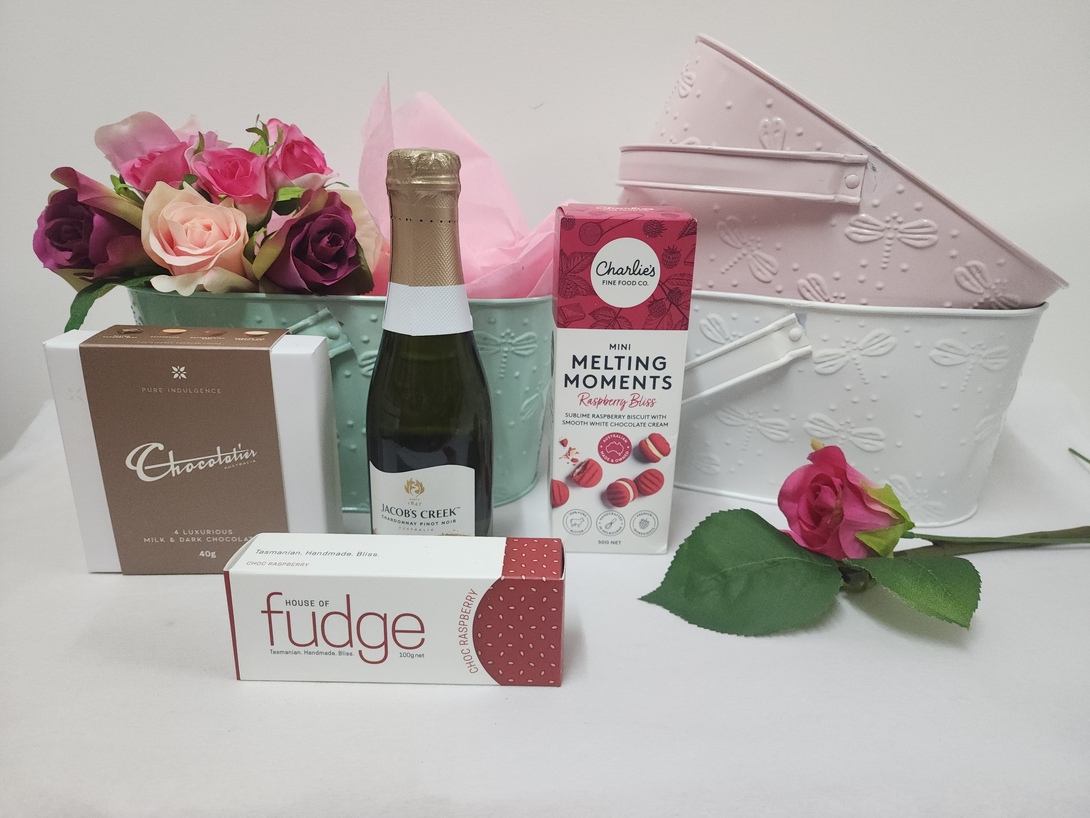 Presented in a metal décor oval bucket with handle – cello wrapped with handtied satin bows