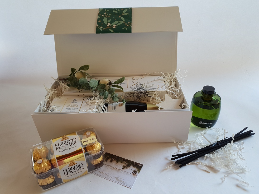beautifully presented in a quality reusable matte white gift box with magnetic closure, finished with paper wrap band ribbon and Christmas pinecone decoration. Eucalyptus leaf and Gumnut spray and gift card.