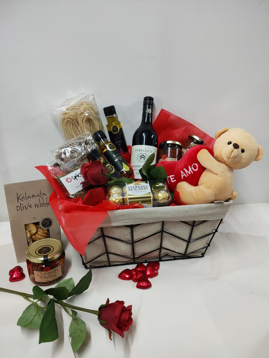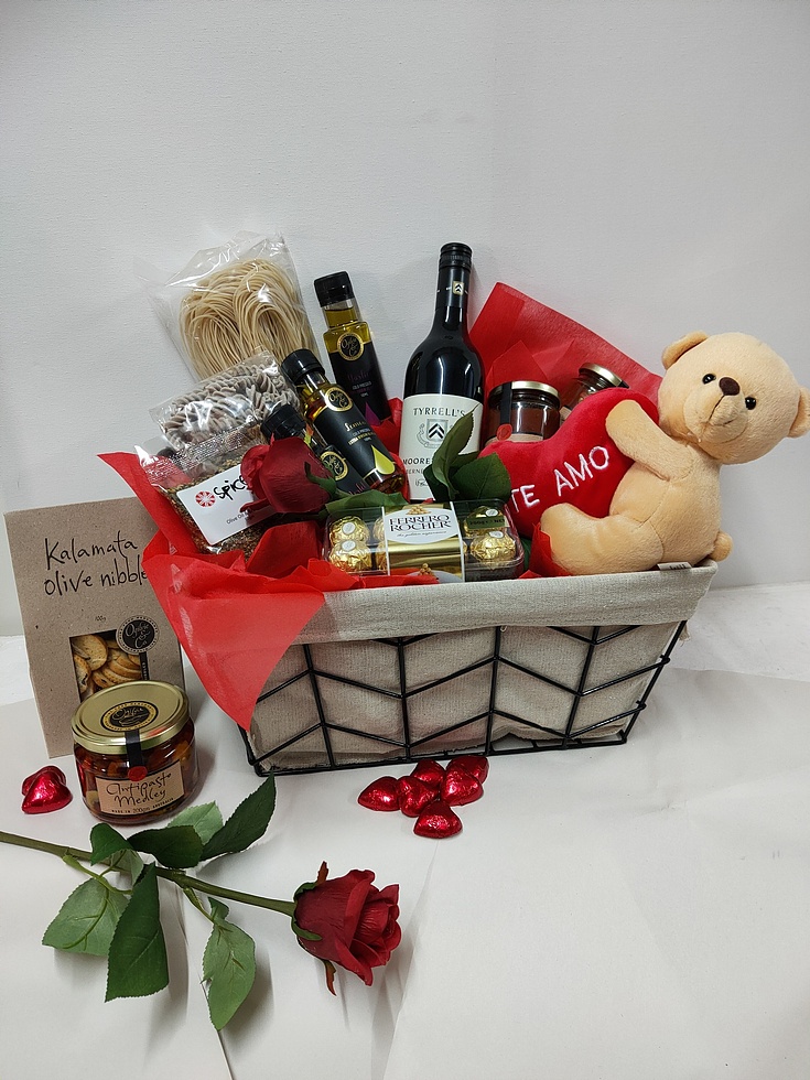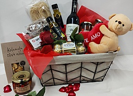 Presented in a quality wire décor basket with lining, cello wrapped with hand-tied red satin bows.