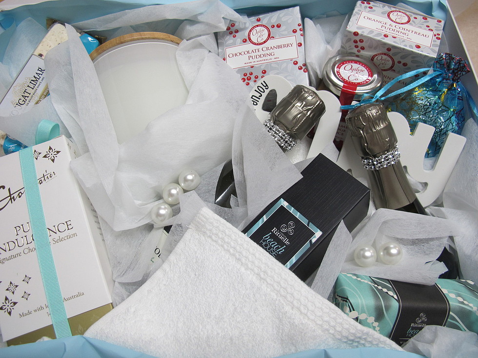 Diamonte trimmed Boxed Chocolates, Tiffany Blue Candle with diamonte trim, Personal products from Urban Rituelle, Silver Penny Pudding, Two Mini Pinot Chardonnay Bubbles. Presented in a quality gloss white reusable gift box with Tiffany Blue Satin ribbon and Diamante trim.