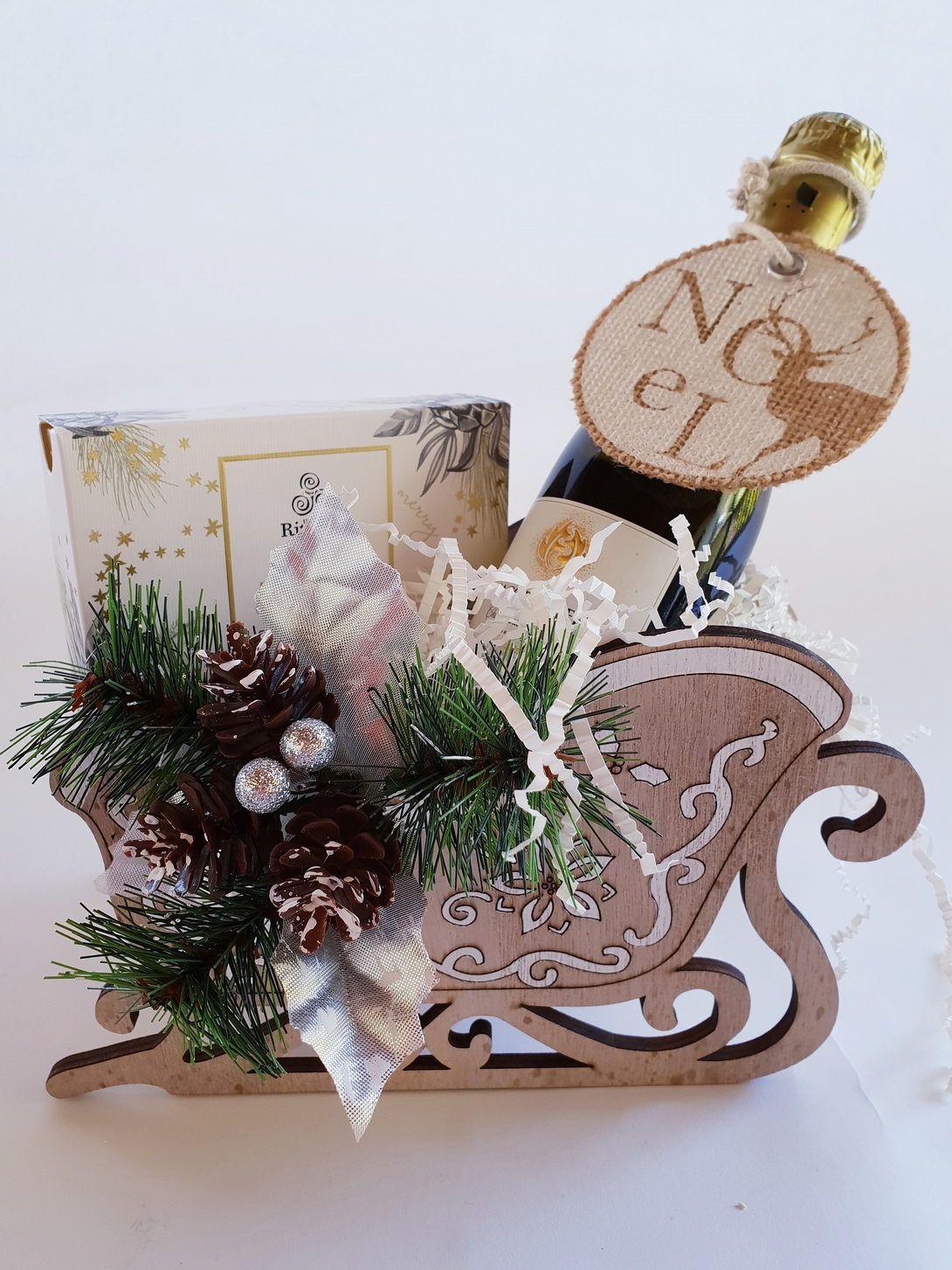 Simple pleasures to give and receive - a gift box of 2 x 110gm Cypress soaps and Piccolo of Jacob’s Creek Pinot Chardonnay beautifully cello wrapped in a natural and white wooden sleigh with Christmas pinecone pick and gift tag.